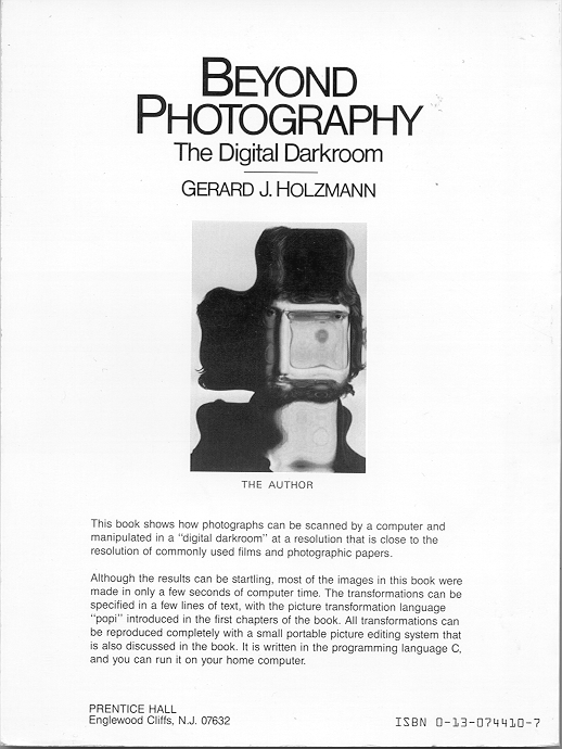 The C sources for the popi (portable pico) image editor that are discussed in the book can still be downloaded from Bell Labs as a shell archive. Also available is a tar-file with the pre-ANSI C source code for the original pico implementation for the VAX, from 1984, including the on-the-fly compiler that Ken Thompson and Rob Pike wrote. (Of course, unless you still have a VAX-750 from the early eighties, this is mostly for inspiration.) Although the book never sold a large number of copies, it inspired a lot of people in different ways. For many years there was a blossoming users group that maintained an extended version of the sources, with support for many different types of displays (see for instance the archive from Rich Burridge's site). Some re-implementations of the software as Java applets have also been spotted on the web at various points in time. In 1989 CNN Science and Technology Report covered the digital image editing method introduced in the book (see clip). We also made a short video (PixelFace), a portion of which was included in the CNN story. Especially after the book went out of print, it has become somewhat of a cult-classic, cherished by geeks and gurus for its irreverent distortions of the pictures of some well-known computer scientists that all worked at Bell Labs at the time the book first came out, e.g., Al Aho (now at Columbia University), Ken Thompson (now retired from Google), Dennis Ritchie (who sadly passed away in October 2011), Rob Pike (now at Google in Australia), Jon Bentley (now at Avaya), Doug McIlroy (now at Dartmouth), Theo Pavlidis (now retired from the State University of NY), Greg Chesson (sadly passed away in June 2015), Luca Cardelli (now at Microsoft Research), and of course Peter Weinberger, one of our first victims of image transformations (now also at Google). (See pjw.html for some background on this.) In retrospect, the book is also notable for first coining the term digital darkroom. At the time the book was published, the term most commonly used was the misnomer 'electronic darkroom.' The pico and popi (portable pico) editors predate many now familiar mainstream photo editing programs, such as Adobe Photoshop. You can still find many of the effects from the book among the more popular effects that are included in Photoshop (though without credit to the book alas). The book also made some seemingly wild predictions about the coming switch to digital photography. For instance, on page 8, it says: